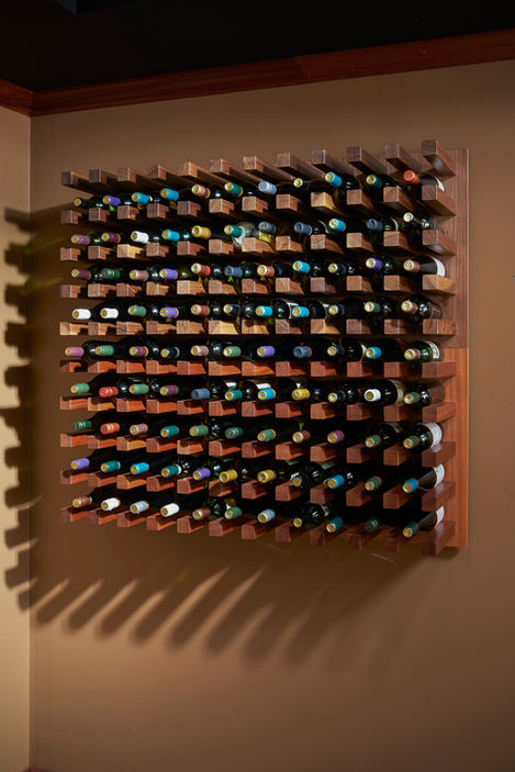 VINIUM – V 2 X 2 SERIES is a contemporary modular solution made up of 2’ x 2’ panels that will maintain bottle spacing when panels are connected horizontally and vertically. Solid hardwood blocks create a stunning “floating” visual effect. The modular panels attach to the walls with a 'Z' clip system. Each panel holds 20 bottles, making this an ideal option for smaller or uniquely shaped spaces.